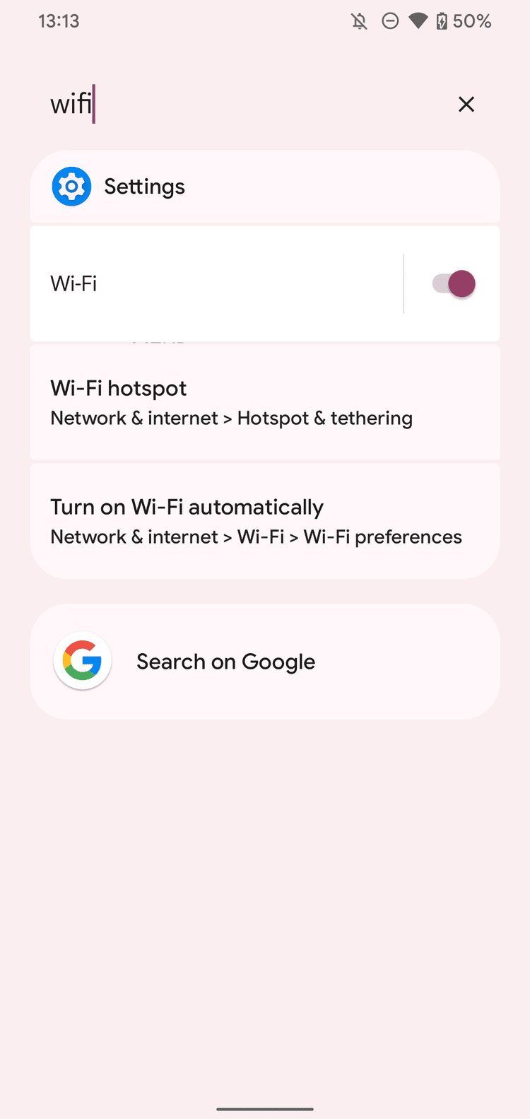 Google đã bổ sung chức năng tương tự vào Android 12. Cách triển khai của Google có một ưu điểm: bạn có thể bật tắt một số thiết lập, chẳng hạn như Wi-Fi, ngay trong giao diện tìm kiếm.