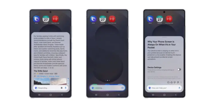 Ví dụ, khi người dùng nói “Tôi không muốn màn hình tắt khi vẫn đang nhìn vào máy”, Bixby sẽ tự động kích hoạt tính năng giữ màn hình sáng khi đang sử dụng mà không cần mở phần cài đặt thủ công. Nếu người dùng hỏi “Vì sao màn hình luôn sáng khi để trong túi?”, trợ lý sẽ phân tích tình huống và gợi ý bật bảo vệ chạm nhầm, cho phép kích hoạt trực tiếp ngay từ giao diện đề xuất.