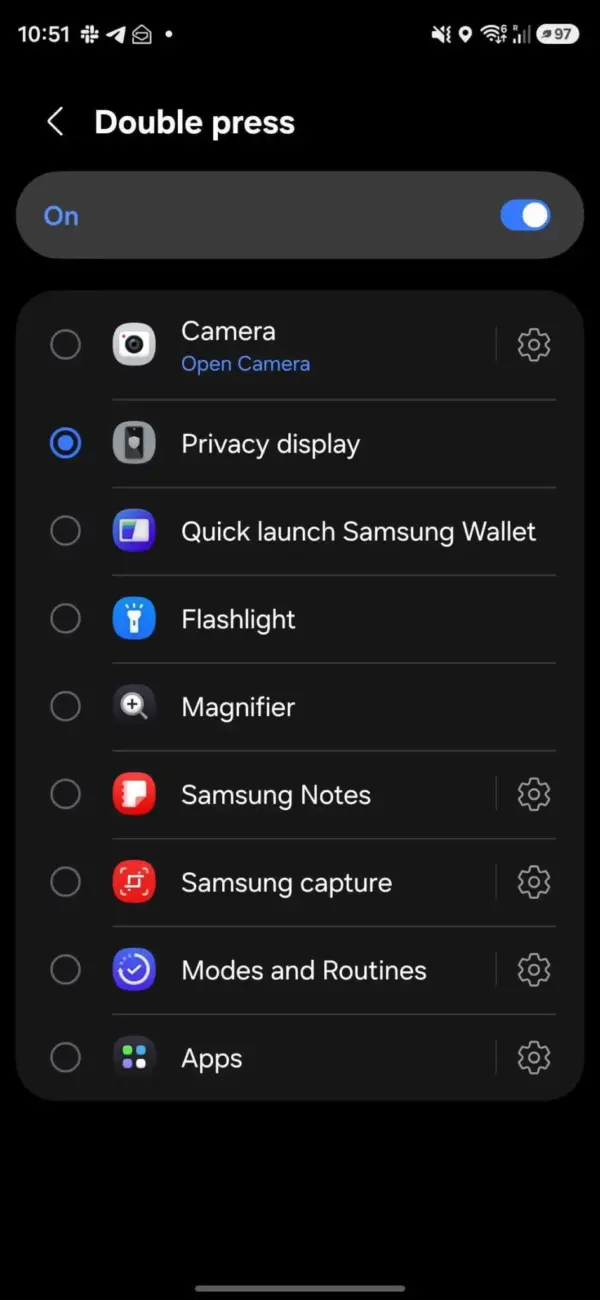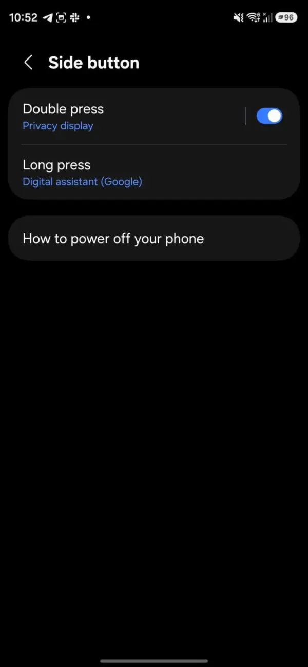 Cách nhanh nhất để kích hoạt Privacy Display là nhấn đúp nút cạnh bên. Khi đã thiết lập, bạn không cần chạm vào màn hình, chỉ cần thao tác hai lần liên tiếp vào nút nguồn để bật chế độ bảo mật.