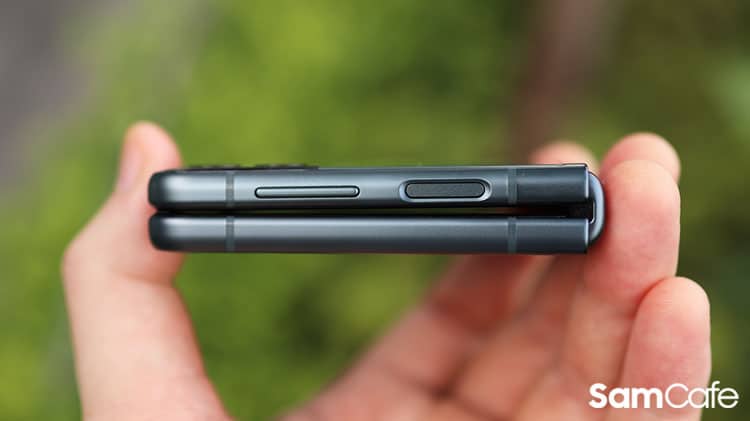 Galaxy Z Flip 3 có phím nguồn kiêm đầu đọc dấu vân tay ở cạnh bên. Nó khá là chìm nên khó xác định vị trí khi đang vội. Nhưng đầu đọc hoạt động rất nhanh chóng và chính xác một cách đáng kinh ngạc. Còn phím âm lượng thì có hành trình duy chuyển và độ phản hồi tuyệt vời.