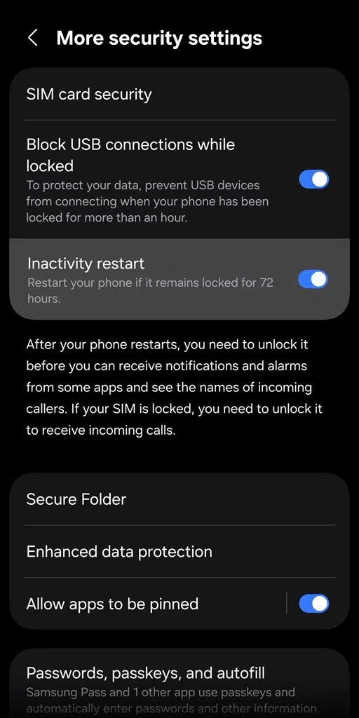 Tính năng mới xuất hiện trong mục Cài đặt > Bảo mật và quyền riêng tư > Cài đặt bảo mật khác. Khi được bật, hệ thống sẽ theo dõi trạng thái khóa của thiết bị và tự động khởi động lại nếu máy không được mở khóa trong 72 giờ liên tục. Sau khi khởi động lại, điện thoại chuyển sang trạng thái bảo mật cao hơn, yêu cầu người dùng xác thực lại bằng mã PIN, mật khẩu hoặc sinh trắc học trước khi có thể truy cập đầy đủ vào dữ liệu.