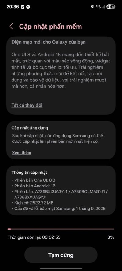 Bản cập nhật có mã firmware A736BXXUAGYJ1 / A736BOLMAGYJ1, dung lượng khoảng 2,5GB, tích hợp bản vá bảo mật tháng 9/2025. Người dùng có thể tải và cài đặt bằng cách vào Cài đặt > Cập nhật phần mềm > Tải về và cài đặt.