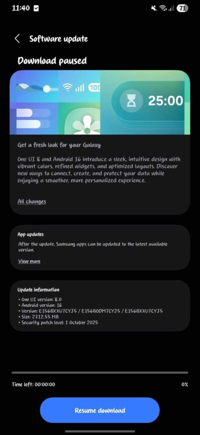 Theo thông tin từ cộng đồng Samsung, bản cập nhật có dung lượng khoảng 2,31GB và mã phần mềm E156BXXU7CYJ5. Người dùng có thể kiểm tra và tải về bằng cách vào Cài đặt > Cập nhật phần mềm > Tải về và cài đặt.