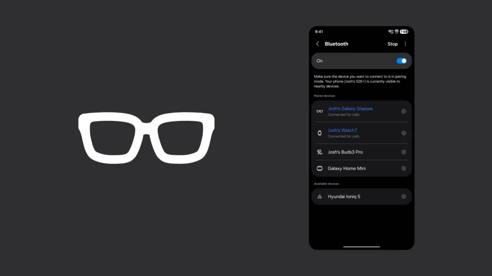 Cụ thể, Galaxy Glasses sẽ hiển thị trong danh sách thiết bị Bluetooth trên điện thoại, tương tự như tai nghe Buds, đồng hồ Watch hay nhẫn thông minh. Thiết bị được nhận diện với tên gọi riêng cùng biểu tượng đơn giản, mô phỏng phần khung kính ở góc nhìn trực diện, đồng bộ phong cách thiết kế với các thiết bị khác trong hệ sinh thái.