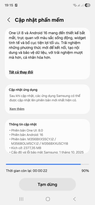 Theo ghi nhận, bản cập nhật có mã phần mềm M356BXXS5CYJ2 / M356BOLM5CYJ2 / M356BXXU5CYI8, dung lượng khoảng 2,38 GB, đi kèm bản vá bảo mật tháng 10/2025.