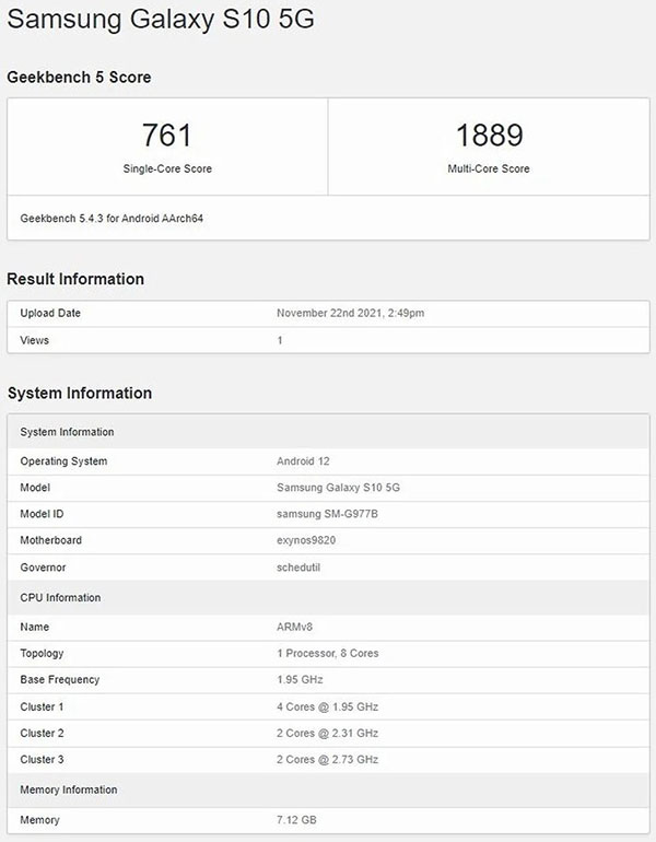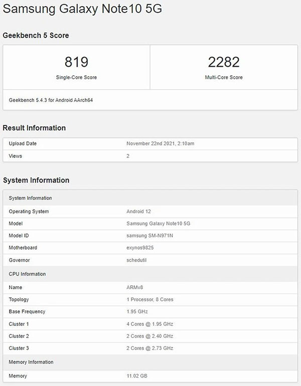 Samsung dường như đang phát triển Android 12 và One UI 4.0 cho các mẫu điện thoại thông minh cao cấp năm 2019 của mình, bao gồm dòng Galaxy S10 và dòng Galaxy Note 10. Phiên bản 5G của các thiết bị này đã hiện đã được tìm thấy trên trang đo điểm chuẩn trực tuyến Geekbench với phiên bản Android 12. Công ty Hàn Quốc có thể đang thử nghiệm trước khi tung ra phiên bản chính thức trong thời gian tới.