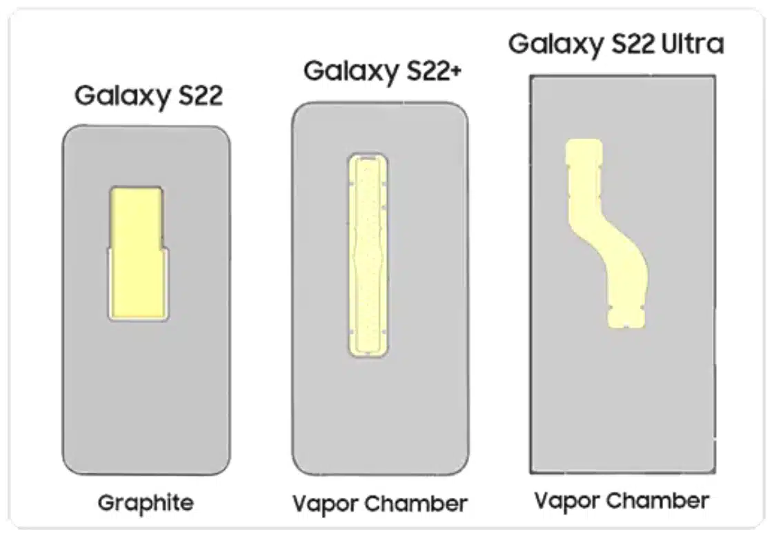 Bài kiểm tra điểm số hiệu năng gần đây cho thấy dòng Galaxy S23 mạnh hơn gấp đôi so với Galaxy S22 chạy Exynos 2200. Tuy nhiên tất cả những cải tiến này có thể sẽ phải trả giá bằng việc thiết bị sẽ nóng hơn khi hoạt động ở mức hiệu năng cao trong thời gian dài. Để khắc phục vấn đề quá nhiệt, Samsung dường như đã trang bị cho các điện thoại mới của mình buồng hơi lớn hơn. Mặc dù vẫn chưa có hình ảnh thực tế nào của hệ thống làm mát bên trong Galaxy S23, nhưng một bản vẽ thô đã cho thấy điều này, hứa hẹn dòng sản phẩm năm nay có khả năng làm mát tốt hơn so với thế hệ trước.