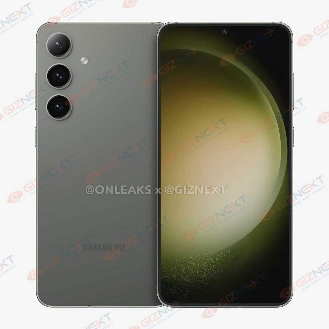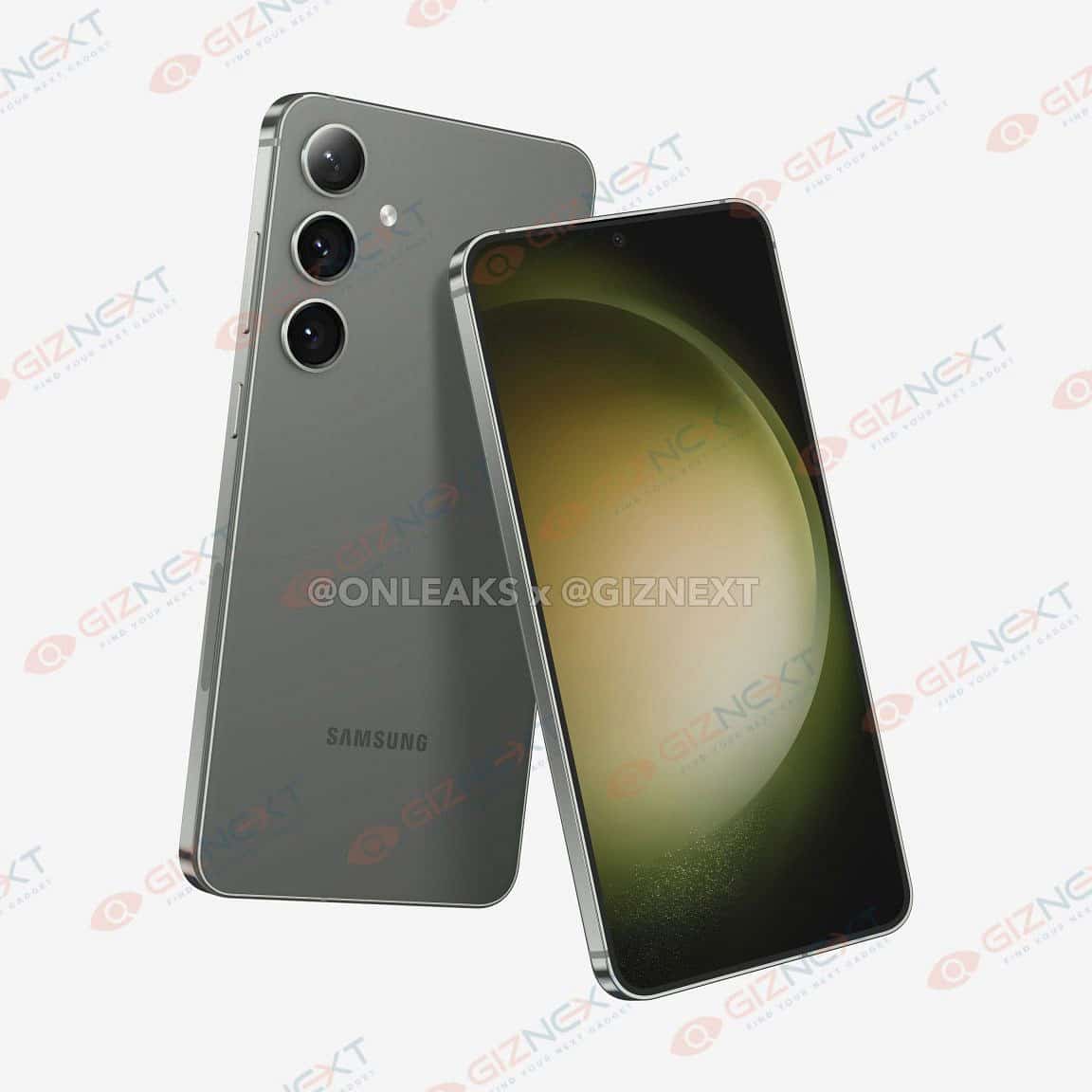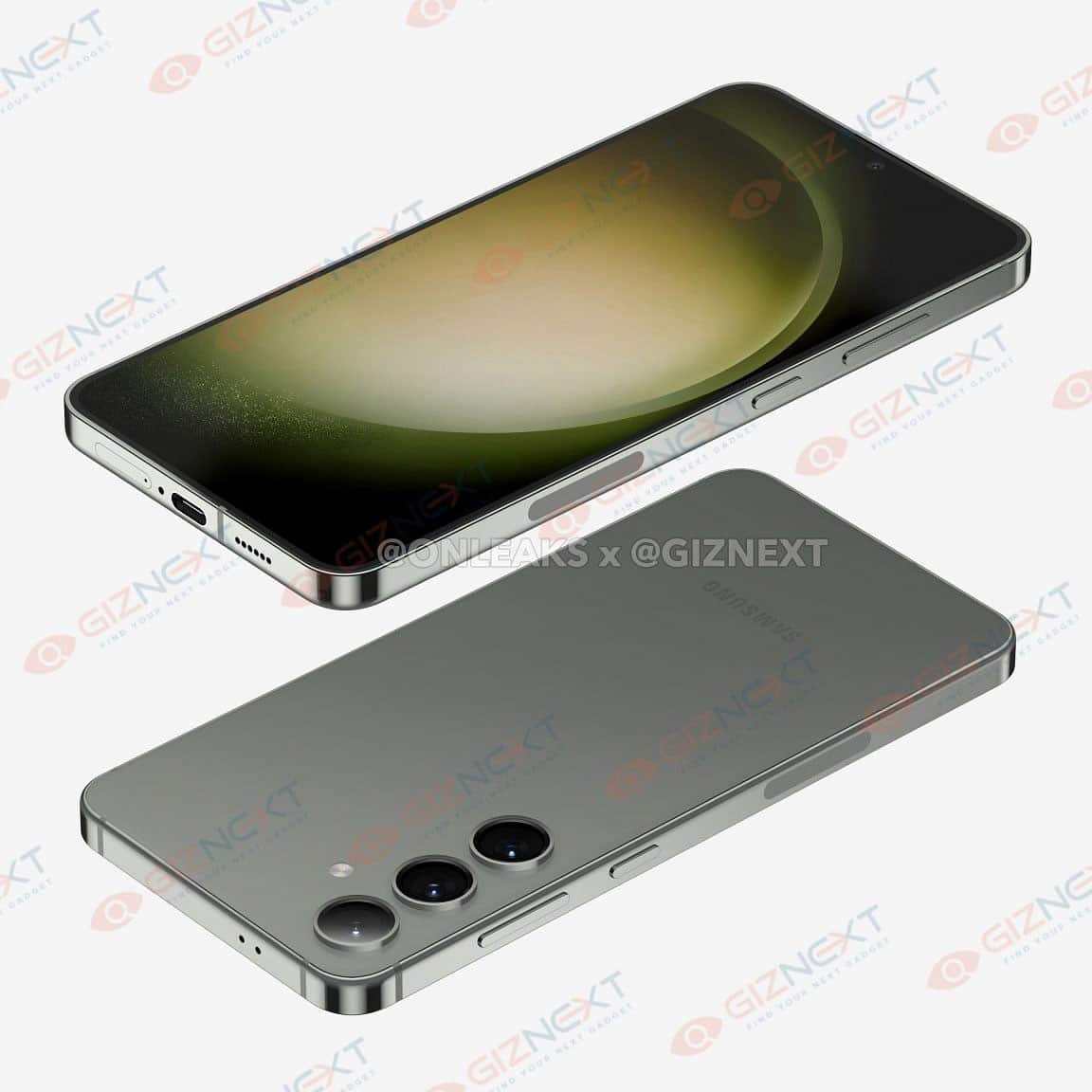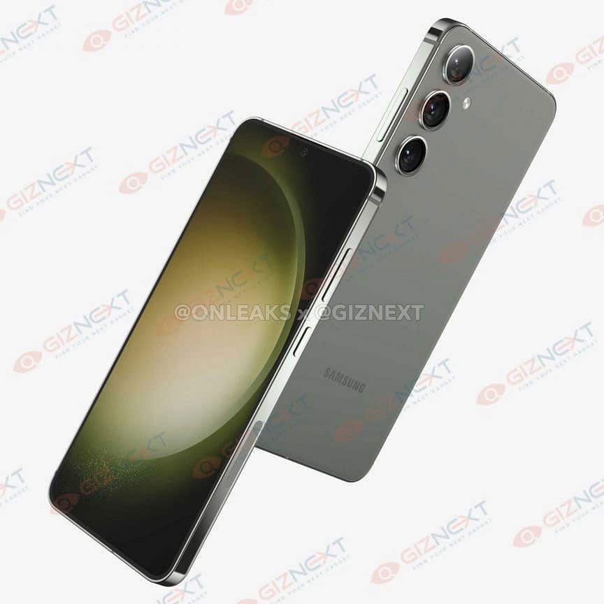 Galaxy S24+ có kích thước 158,5 x 75,9 x 7,75mm, cao và hẹp hơn một chút so với Galaxy S23+. Phía trước là màn hình phẳng 6,7 inch với phần viền mỏng hơn, camera selfie đục lỗ và cảm biến vân tay siêu âm dưới màn hình. Trong loạt ảnh render, chiếc điện thoại này dường như có màu xám hoặc màu xanh lục.