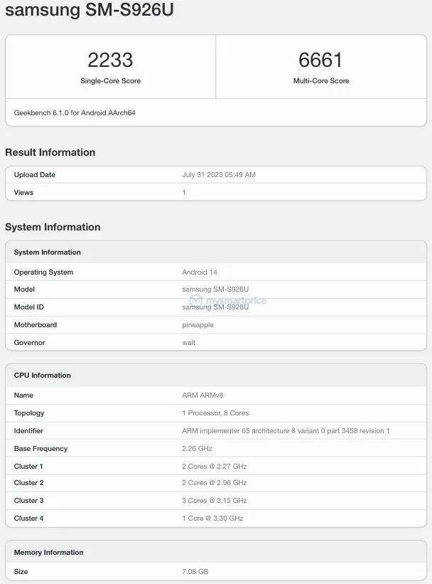 Mẫu Galaxy S24+ mới có tên mã SM-S926U và đã được thử nghiệm Android 14 trên Geekbench 6. Thiết bị sử dụng chipset Snapdragon 8 Gen 3 cho điểm số đơn nhân và đa nhân lần lượt là 2233 và 6661. Đáng tiếc, chiếc điện thoại này chỉ có RAM 8GB, cho thấy Samsung có ý định cắt giảm chi phí. Điều này cũng đồng nghĩa với việc Galaxy S24+ vẫn sẽ sử dụng khung viền nhôm thay vì titan như mẫu Ultra.