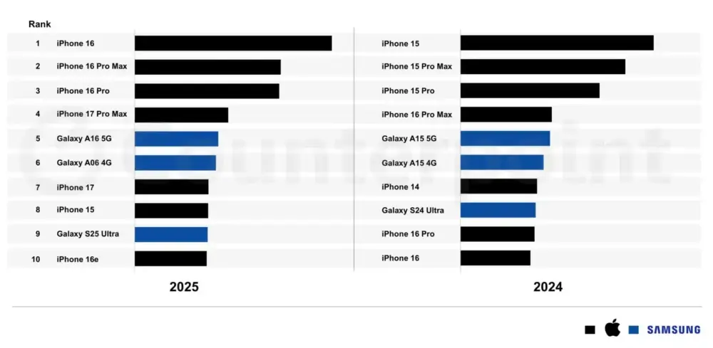 Theo báo cáo mới từ Counterpoint Research, iPhone 16 đứng đầu bảng xếp hạng, theo sau lần lượt là iPhone 16 Pro Max, iPhone 16 Pro và iPhone 17 Pro Max. Các thiết bị của Samsung chỉ bắt đầu xuất hiện từ vị trí thứ năm, với số lượng góp mặt ít hơn đáng kể so với iPhone.