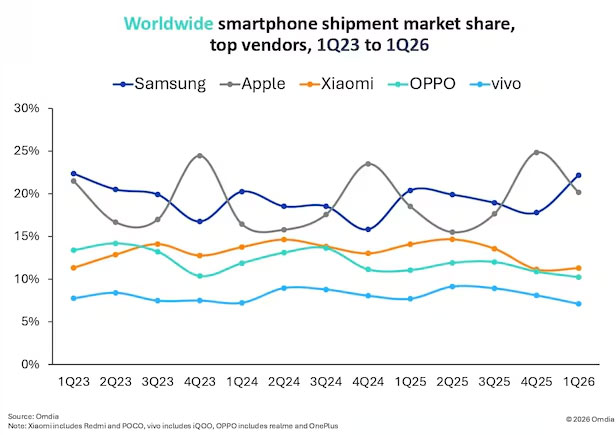 Theo dữ liệu từ Omdia, Samsung chiếm 22% thị phần toàn cầu, trong khi Apple đạt 20%. Các vị trí tiếp theo lần lượt thuộc về Xiaomi (11%), Oppo (10%) và Vivo (7%). Khoảng cách giữa hai vị trí dẫn đầu đã được nới rộng so với cùng kỳ năm trước, phản ánh rõ lợi thế của Samsung trong giai đoạn đầu năm.