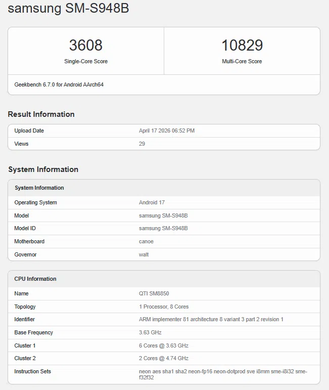 Kết quả benchmark ghi nhận 3.608 điểm đơn nhân và 10.829 điểm đa nhân, gần tương đương với hiệu năng của thiết bị khi chạy Android 16 cùng One UI 8.5. Điều này cho thấy bản dựng mới đã đạt mức ổn định nhất định, đủ để tiến gần hơn tới giai đoạn thử nghiệm công khai.