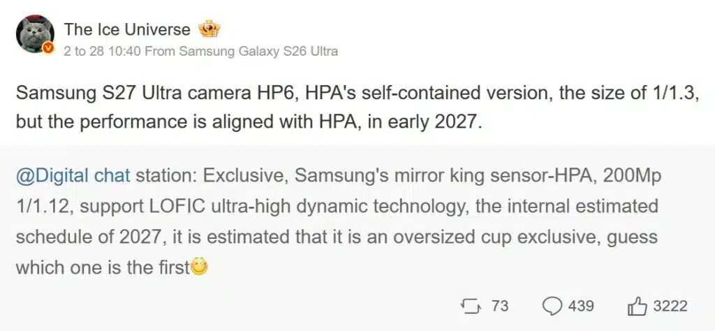 Nguồn tin cũng tiết lộ cảm biến HPA dự kiến ra mắt trong năm 2027. Dù chưa nhắc trực tiếp đến thiết bị nào, leaker Ice Universe sau đó xác nhận Galaxy S27 Ultra sẽ sử dụng một biến thể dựa trên cảm biến này thay vì phiên bản HPA nguyên bản.