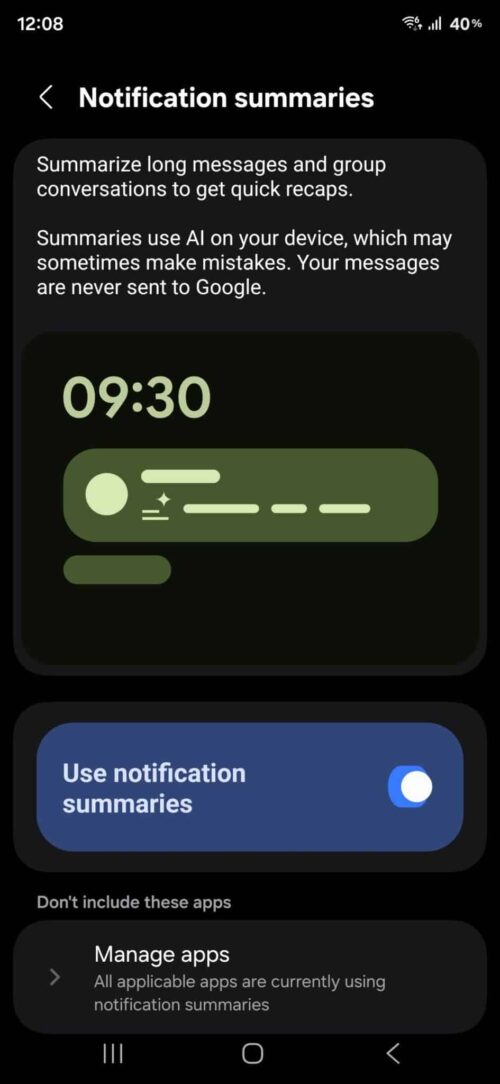 Trong phần cài đặt, người dùng có thể chọn ứng dụng muốn loại trừ khỏi tính năng tóm tắt. Dù vậy, hiện mọi ứng dụng cài đặt trên máy đều được hiển thị mặc định và chưa có tùy chọn loại bỏ.