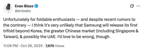 Nguồn tin cho biết Hàn Quốc, Trung Quốc, Singapore, Đài Loan và có thể là UAE sẽ là những nơi đầu tiên đón nhận Galaxy TriFold. Trong khi đó, châu Âu và Bắc Mỹ sẽ tạm thời nằm ngoài danh sách phân phối.