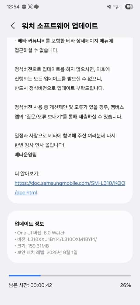 Hiện bản cập nhật One UI 8 Watch dựa trên Wear OS 6 đã được triển khai tại Hàn Quốc, trước mắt dành cho nhóm người dùng thử nghiệm beta. Bản cập nhật đi kèm bản vá bảo mật tháng 9/2025, mang số hiệu L310XXU1BYI4, có dung lượng khoảng 160MB cho người dùng beta và gần 2GB đối với những ai cập nhật trực tiếp từ phiên bản cũ.