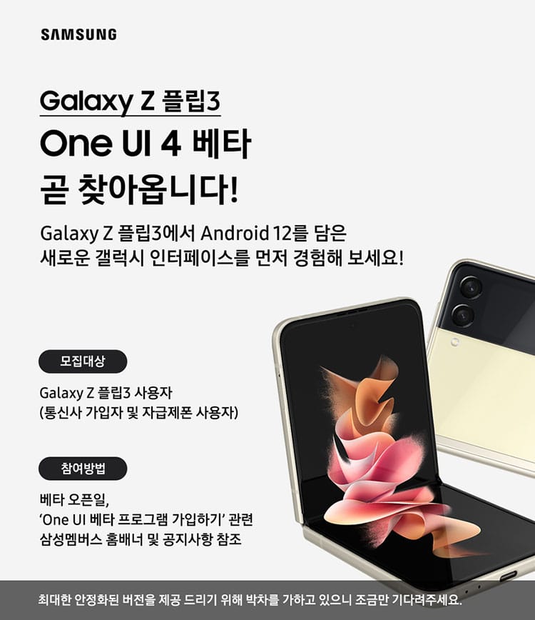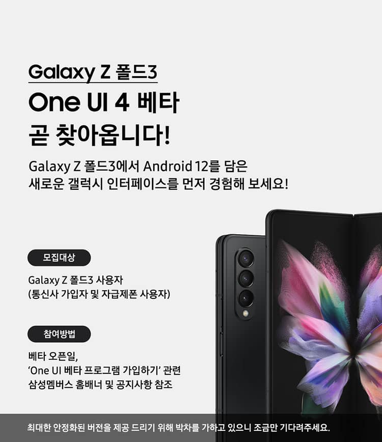 Người dùng Galaxy Z Fold 3 và Galaxy Z Flip 3 quan tâm đến chương trình One UI 4.0 Beta có thể tham gia bằng cách đăng ký bằng cách truy cập ứng dụng Samsung Members, đăng nhập thông qua tài khoản Samsung của mình và nhấn vào lời mời tham gia One UI 4.0 Beta xuất hiện trên banner ở trang chủ.