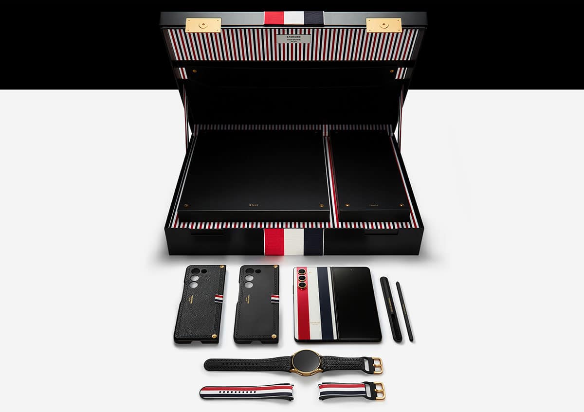 Cả Galaxy Z Fold 5 và Galaxy Watch 6 Thome Browne đều sở hữu những chủ đề và mặt đồng hồ phiên bản đặc biệt của thương hiệu biểu tượng thời trang nổi tiếng. Ngoài hai thiết bị này, đi kèm trong hộp Bộ sưu tập Samsung x Thom Browne là S Pen Fold Edition, hai bao da Galaxy Z Fold 5, hai dây đeo Galaxy Watch 6, củ sạc 25W, cáp dữ liệu và Bộ sạc không dây Galaxy Watch. Tất cả đều mang dấu ấn đặc trưng của Thom Browne.
