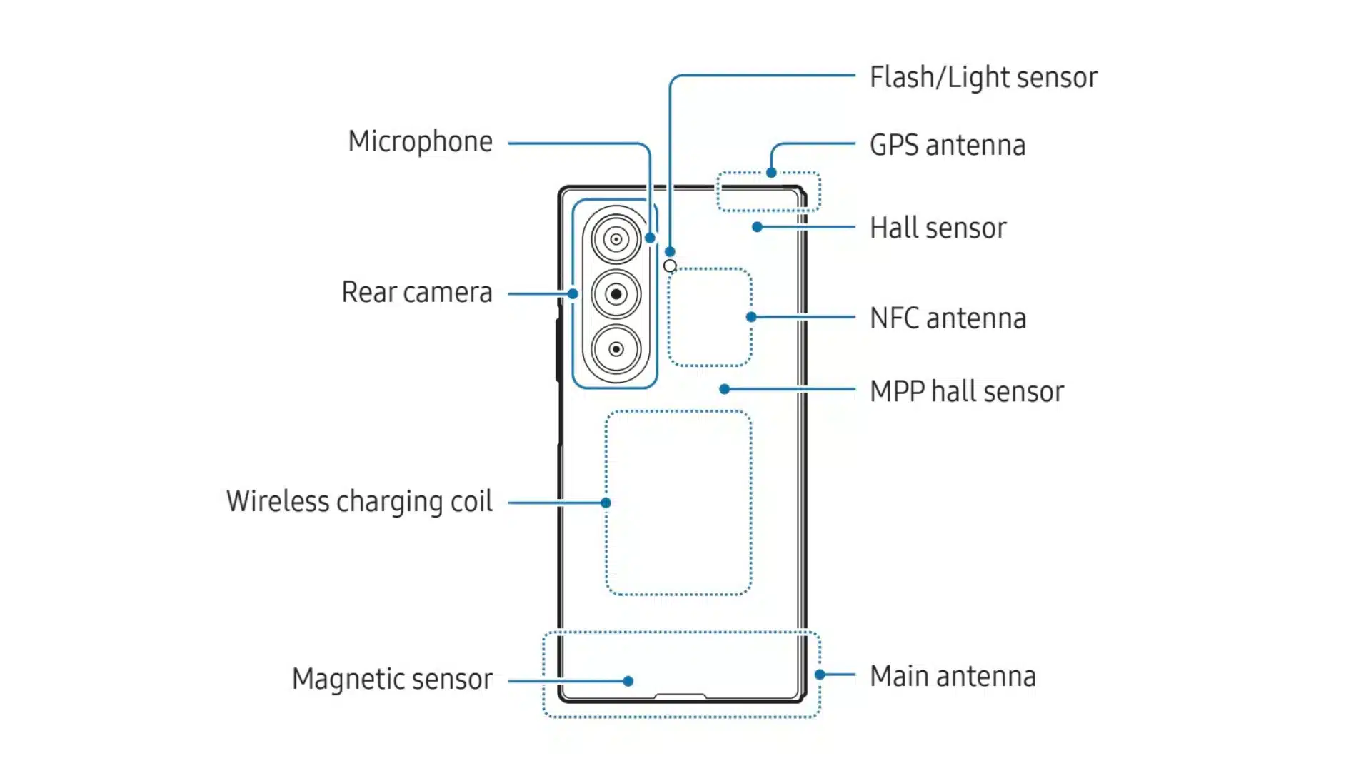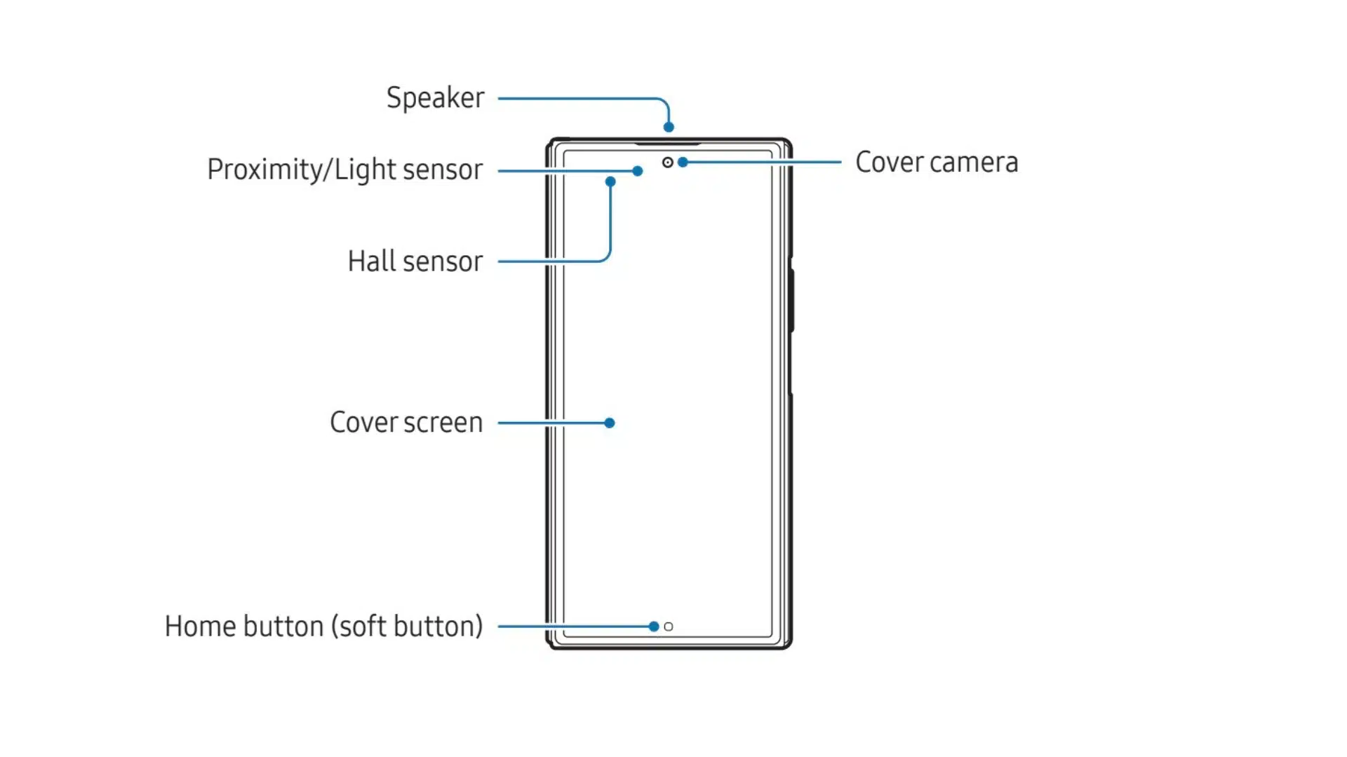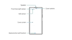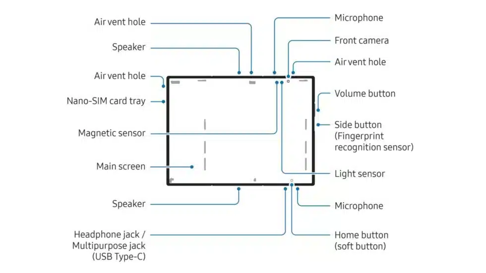 Sách hướng dẫn mô tả chính xác vị trí mọi thành phần trên Galaxy Z TriFold. Sơ đồ cho thấy lỗ thoát khí, hệ thống micro, loa, cảm biến nam châm, khe nano SIM, nhiều cảm biến bổ sung và cả cổng tai nghe 3.5 mm. Với độ mỏng 3.9 mm khi mở ra, chi tiết này cho thấy Galaxy Z TriFold vượt trội về khả năng tối ưu không gian so với Galaxy Z Fold 7, vốn không thể tích hợp cổng 3.5 mm.