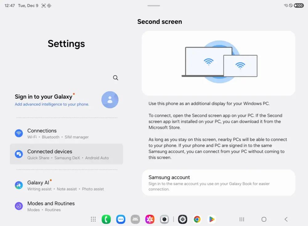 Theo phát hiện từ Android Authority, Galaxy Z TriFold hỗ trợ Second Screen, tính năng trước đây chỉ xuất hiện trên những mẫu tablet Galaxy cao cấp. Second Screen cho phép thiết bị đóng vai trò như màn hình không dây thông qua Miracast, giúp người dùng mở rộng không gian làm việc trên Windows hoàn toàn không cần cáp kết nối. Chỉ cần mở giao diện Second Screen trên TriFold, máy tính Windows ở gần sẽ tự động nhận diện để ghép nối.