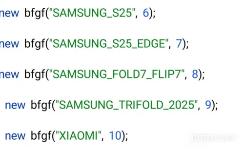 Theo Android Authority, khi phân tích mã trong ứng dụng Google phiên bản 16.43.60.sa.arm64, các chuyên gia phát hiện những chuỗi mã liên quan đến thiết bị gập ba của Samsung. Dữ liệu này nằm trong danh sách nội bộ của Google, dùng để xác định các mẫu máy đủ điều kiện nhận ưu đãi miễn phí Gemini AI. Trong danh sách xuất hiện một cái tên khá bất ngờ: “Trifold”. Dù không có tiền tố “Galaxy Z”, điều này cũng không quá lạ, bởi một số mẫu Galaxy khác cũng được liệt kê tương tự. Đặc biệt, sự xuất hiện của con số “2025” cho thấy Galaxy TriFold có thể được thương mại hóa trong thời gian tới.