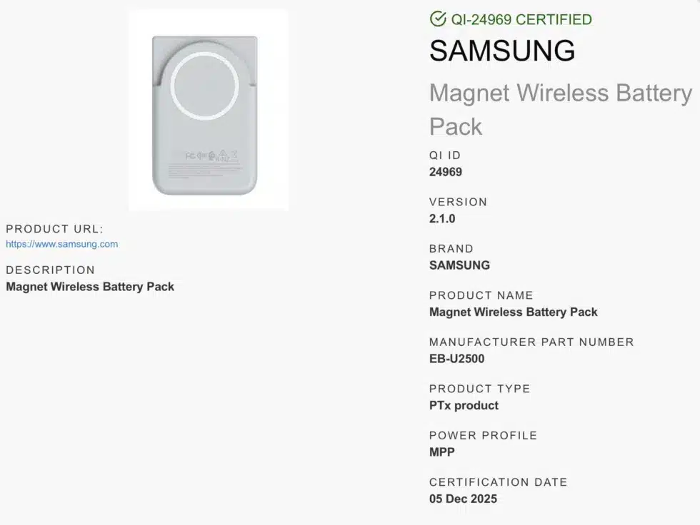 Thông tin mới thu thập từ dữ liệu hải quan cho biết phụ kiện này sở hữu dung lượng 5.000mAh và được sản xuất tại Việt Nam thay vì Hàn Quốc. Trước đó, hình ảnh thực tế của sản phẩm từng xuất hiện trên một trang chứng nhận tại Hàn Quốc nhưng khá mờ. Giờ đây, Wireless Power Consortium (WPC) đã vô tình để lộ sản phẩm với hình ảnh rõ nét hơn, kèm theo một số chi tiết quan trọng.