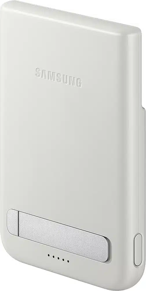 Về thiết kế, EB-U2500 tích hợp chân đỡ gập, cho phép dựng máy theo chiều ngang trong lúc sạc, thuận tiện khi xem video, gọi video hoặc dùng điện thoại như màn hình để bàn. Mặt trước có dãy đèn LED hiển thị dung lượng pin, kèm nút bấm bên hông để kiểm tra nhanh trạng thái.
