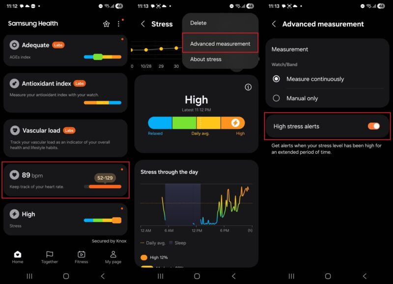 - Tắt mục Cảnh báo căng thẳng cao (High stress alerts) hoặc chuyển sang chế độ Chỉ đo thủ công (Measure only).