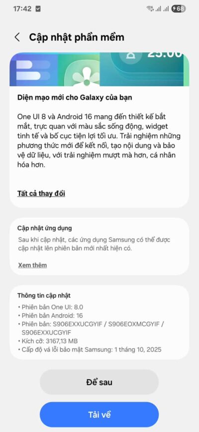 Theo đó, bản cập nhật có dung lượng hơn 3,1 GB và đi kèm bản vá bảo mật tháng 10/2025. Người dùng Galaxy S22, S22+ và S22 Ultra hiện đã có thể kiểm tra cập nhật bằng cách vào Cài đặt > Cập nhật phần mềm > Tải về và cài đặt.