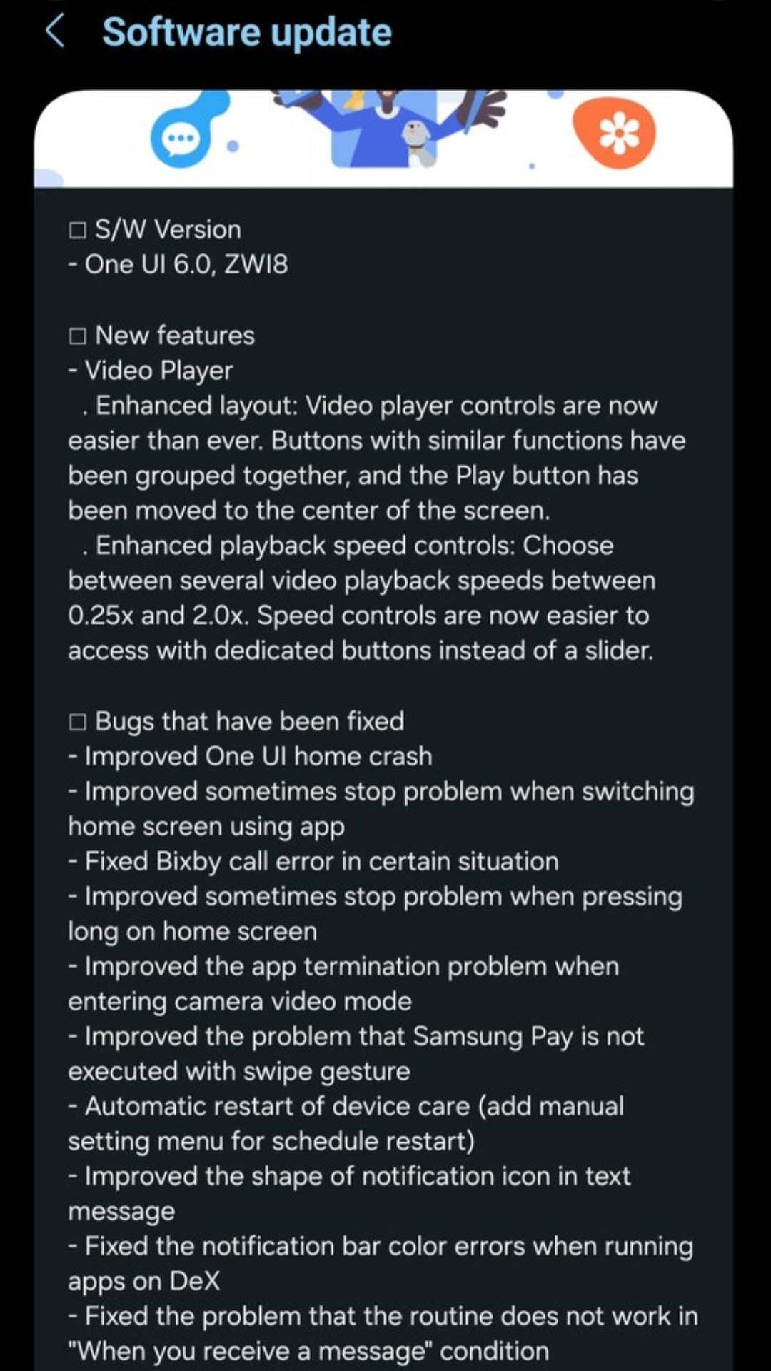 Theo nhật ký thay đổi của Samsung, bản cập nhật One UI 6.0 Beta 3 mang đến bố cục mới cho trình phát video để người dùng dễ dàng điều khiển hơn. Nó cho phép lựa chọn một số tốc độ phát từ 0,25x đến 2,0x. Ngoài ra còn có nhiều cải tiến và sửa lỗi từ các phiên bản trước như: