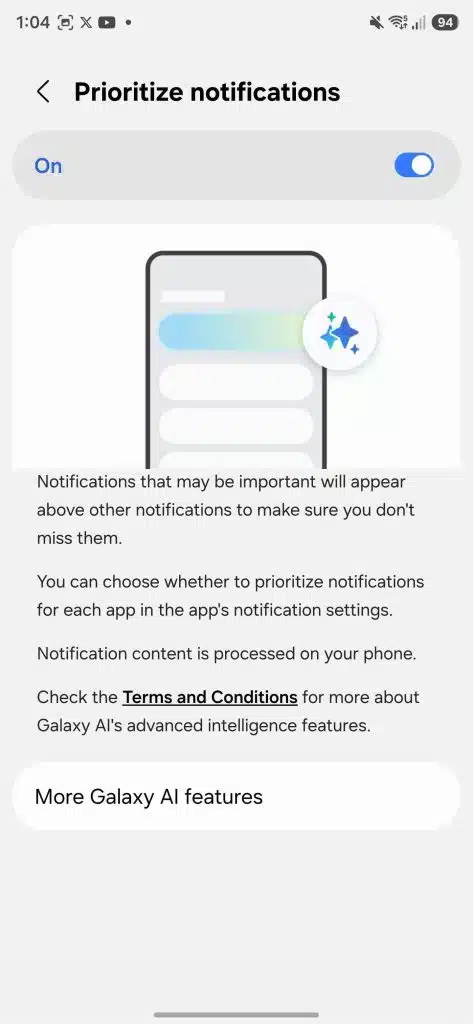 Một trong những thay đổi đáng chú ý là tính năng “Ưu tiên thông báo” (Prioritize notifications) vừa được phát hiện trong bản firmware One UI 8.5 rò rỉ. Tính năng này giúp người dùng đảm bảo không bỏ lỡ các thông báo quan trọng, bằng cách cho phép một số thông báo hiển thị nổi bật hơn so với phần còn lại. Mô tả trong ảnh chụp màn hình cho biết: “Các thông báo quan trọng sẽ được hiển thị phía trên để bạn không bỏ sót.”