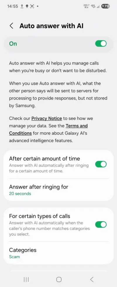 Người dùng sẽ có toàn quyền kiểm soát cách AI phản hồi các cuộc gọi đến. Bạn có thể thiết lập để AI chỉ trả lời một số loại cuộc gọi nhất định như quảng cáo, bán hàng, taxi, giao hàng hoặc các số lạ. Ngoài ra, hệ thống còn cho phép cài đặt thời gian chờ trước khi AI tự động bắt máy, ví dụ sau 20 giây chuông reo mà bạn chưa trả lời, AI sẽ tự động tiếp nhận cuộc gọi. Điều này giúp bạn linh hoạt quyết định nên nghe trực tiếp hay để trợ lý ảo xử lý thay.