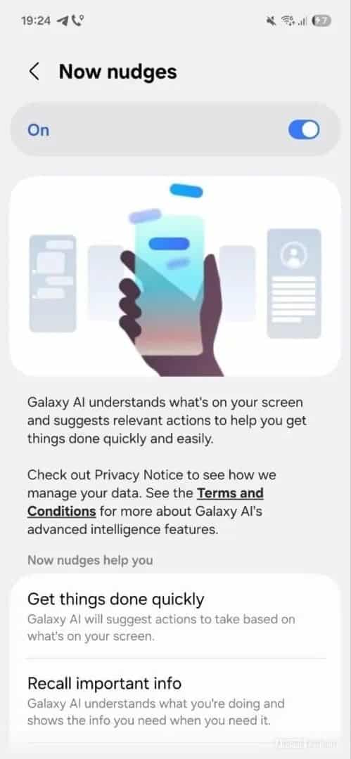 Sau Now Bar, Samsung chuẩn bị bổ sung tính năng thông minh mới có tên Now Nudges. Android Authority đã tìm thấy tính năng này trong bộ file rò rỉ của One UI 8.5. Dựa trên các ảnh chụp màn hình, Now Nudges hoạt động dựa trên Galaxy AI, với cách vận hành khá giống Magic Cue trên Pixel 10. Tính năng này có thể học thói quen sử dụng của bạn và chủ động đưa ra gợi ý phù hợp vào đúng thời điểm.