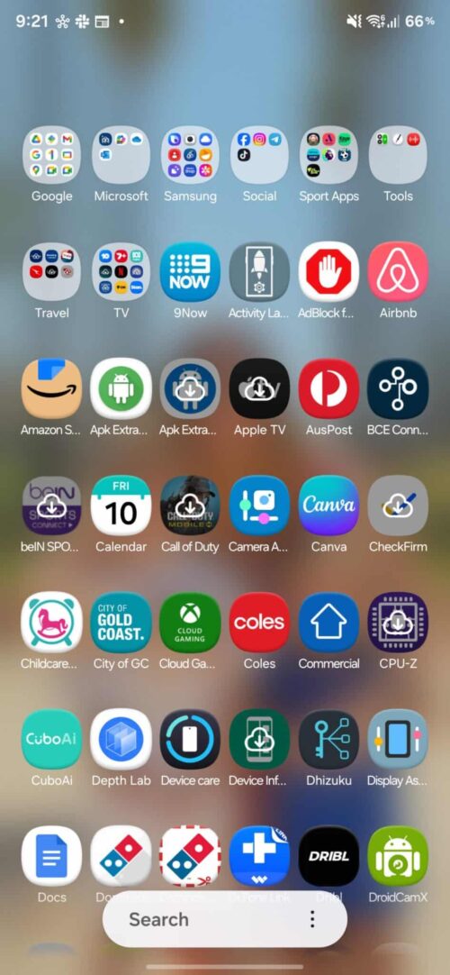 Theo leaker Tarun Vats, thanh tìm kiếm trong ngăn ứng dụng của One UI 8.5 vừa được làm mới hoàn toàn. Thay vì chiếm toàn bộ chiều ngang và hòa màu với hình nền như trước, thanh tìm kiếm mới ngắn hơn, có viền trắng mờ và “nổi” lên trên giao diện. Sự thay đổi này mang lại cảm giác tinh tế, hiện đại và trực quan hơn, giúp ngăn ứng dụng trông gọn gàng và cao cấp hơn hẳn.