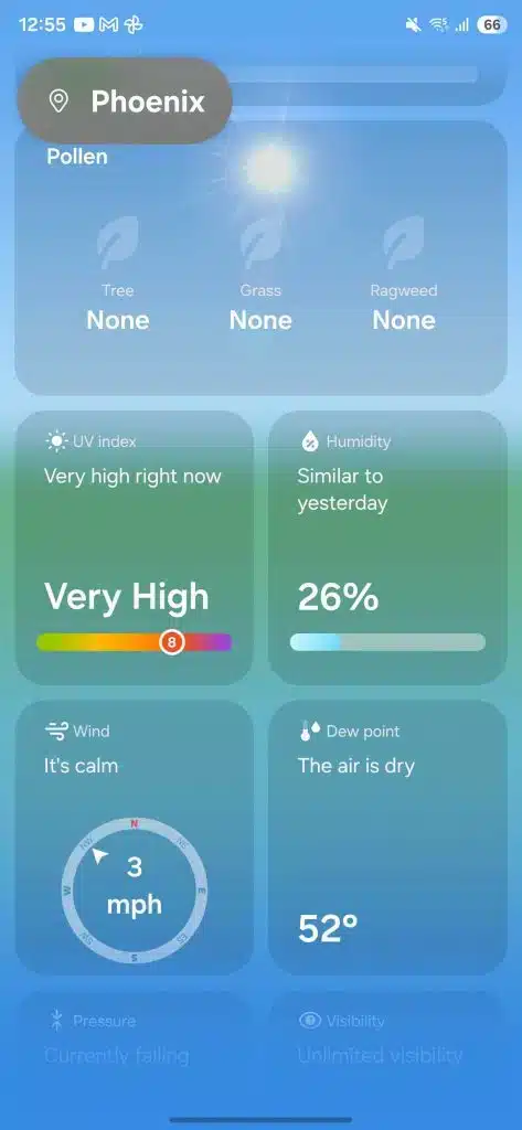 Ứng dụng Thời tiết cũng được làm mới với hiệu ứng chuyển màu ở viền màn hình, mang lại cảm giác mềm mại và cao cấp hơn. Thanh tìm kiếm được đưa xuống phía dưới sau khi bấm vào biểu tượng tìm kiếm, giúp thao tác dễ dàng hơn. Bên cạnh đó, tên địa điểm nay được đặt trong một khung nổi bật ngay trên màn hình chính, giúp người dùng dễ dàng quan sát hơn chỉ với một cái nhìn nhanh.
