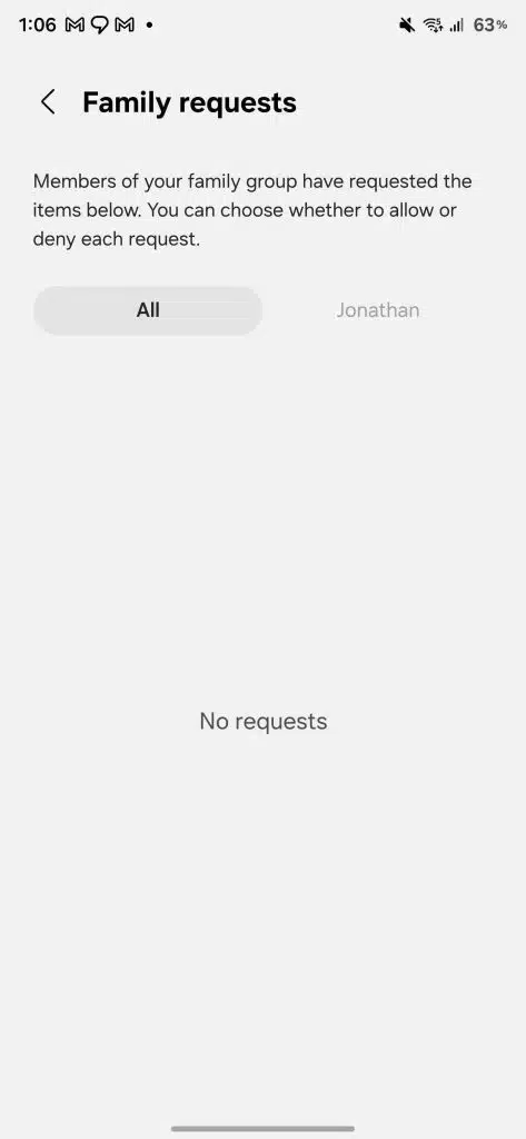 Ngoài ra, One UI 8.5 còn bổ sung trang quản lý yêu cầu từ các thành viên. Ví dụ, khi một người muốn mua game trên Galaxy Store, yêu cầu sẽ hiển thị tại đây để người quản lý phê duyệt. Samsung cũng đang phát triển trang riêng để mời thêm thành viên gia đình, dù hiện tại mới ở dạng thử nghiệm.