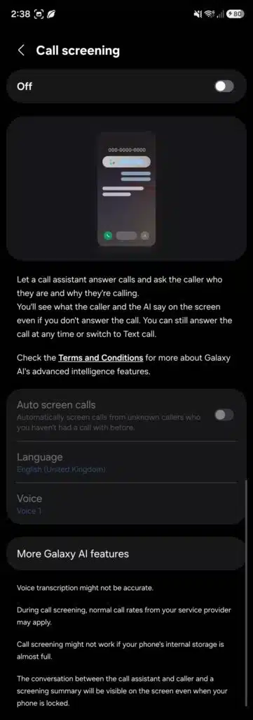 Đáng chú ý, Call Screening được xử lý hoàn toàn trên thiết bị, không phụ thuộc vào máy chủ đám mây. Điều này vừa giúp tăng tốc độ phản hồi, vừa đảm bảo quyền riêng tư cho người dùng. Trong phần cài đặt, Samsung cũng lưu ý rằng Call Screening sẽ không hoạt động nếu bộ nhớ trong của máy gần đầy.