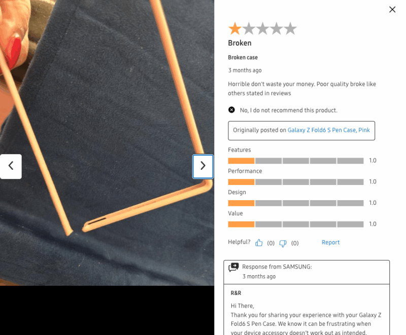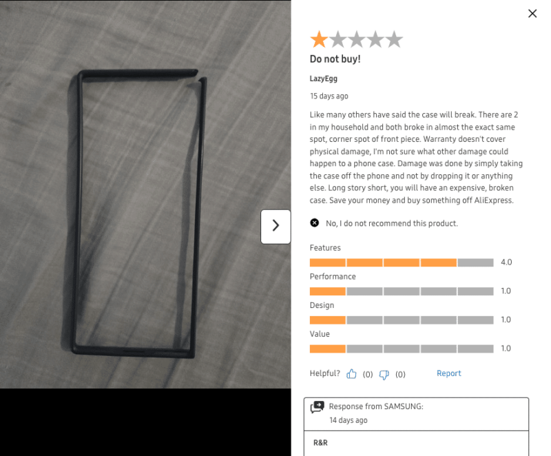 Theo các đánh giá được đăng tải trên cửa hàng trực tuyến của Samsung tại Mỹ, hàng loạt khách hàng cho biết phần viền ốp nhựa quanh màn hình ngoài rất mỏng và dễ gãy, thậm chí chỉ sau vài ngày sử dụng. Một số người dùng còn chia sẻ hình ảnh cho thấy góc ốp bị nứt dù không hề làm rơi máy, khiến sản phẩm nhận điểm đánh giá trung bình chỉ 1,8/5 sao từ hơn 100 lượt phản hồi.