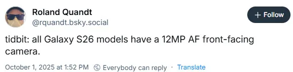 Galaxy S26 đang nóng dần lên với hàng loạt tin rò rỉ, nhưng thông tin mới nhất về camera selfie có lẽ sẽ khiến nhiều người dùng hụt hẫng. Theo nhà báo Roland Quandt (WinFuture), cả ba mẫu Galaxy S26 đều sẽ tiếp tục sử dụng camera trước 12MP với lấy nét tự động, giống hệt ba thế hệ trước đó.