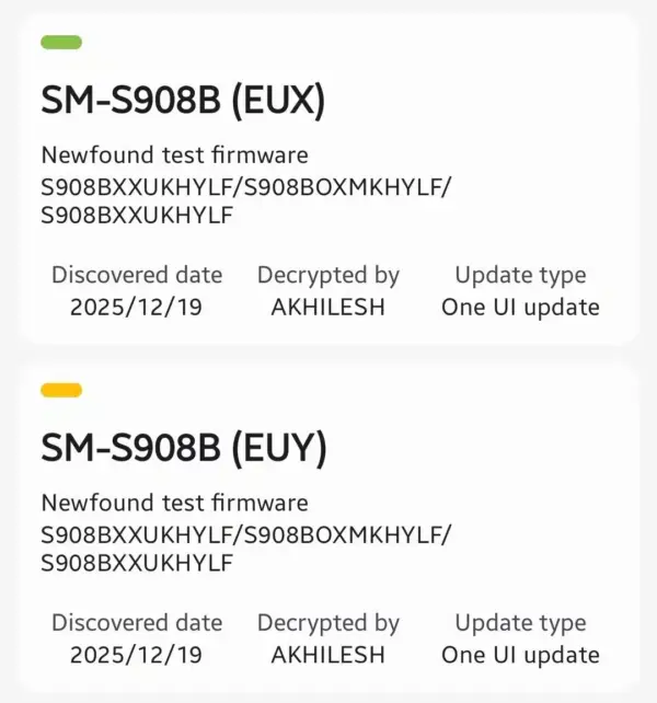 Theo dữ liệu xuất hiện trên máy chủ thử nghiệm của Samsung, Galaxy S22 Ultra đã được ghi nhận với bản dựng One UI 8.5 đầu tiên, thông tin do leaker @Koram_Akhilesh phát hiện. Firmware thử nghiệm hiện có hậu tố HYLF, cho thấy đây là bản nội bộ và chưa phải phiên bản cuối cùng dành cho người dùng.