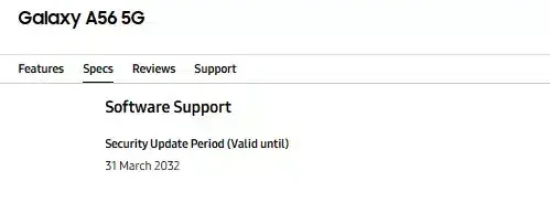Thông tin được phát hiện sau khi trang giới thiệu Galaxy A56 tại nhiều thị trường như Anh và Ấn Độ đổi mốc hỗ trợ từ tháng 3/2031 lên tháng 3/2032. Điều này đồng nghĩa Galaxy A56 đã được đưa vào chương trình bảo mật dài hạn bảy năm – một bước đi không mấy khi Samsung áp dụng cho thiết bị đã ra mắt.