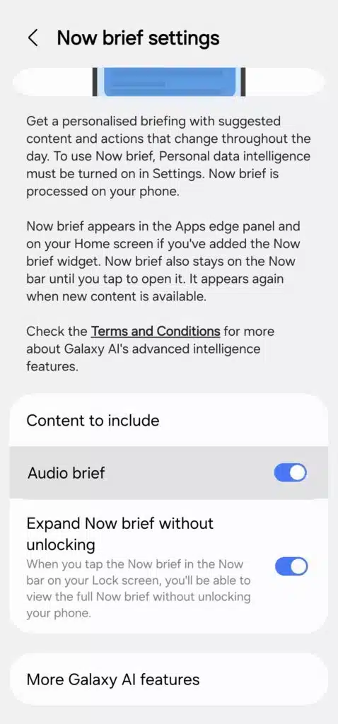 Với bản cập nhật mới của Personal Data Intelligence, người dùng có thêm tùy chọn bật hoặc tắt Audio Brief trong đường dẫn Cài đặt > Galaxy AI > Now Brief, tăng mức độ kiểm soát cho người dùng đối với trung tâm thông tin cá nhân hóa này.