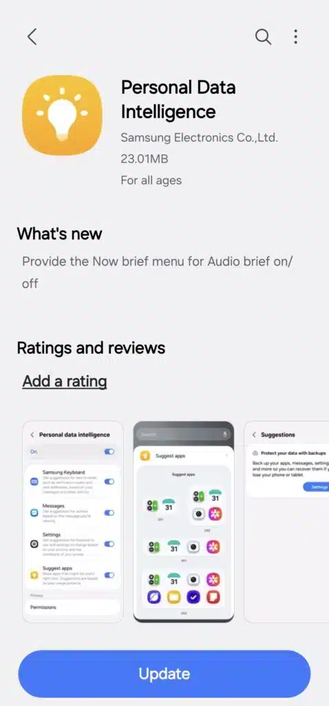 Samsung vừa phát hành bản cập nhật mới cho ứng dụng Personal Data Intelligence, thành phần hệ thống đứng sau các tính năng Galaxy AI cá nhân hóa như Now Brief. Phiên bản mới mang đến một thay đổi nhỏ nhưng hữu ích: người dùng có thể bật hoặc tắt tính năng Audio Brief ngay trong phần cài đặt của Now Brief. Bản cập nhật hiện được phân phối qua Galaxy Store.