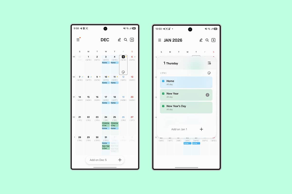 Samsung Calendar được làm mới toàn diện với cách bố trí tab mới, điều hướng nổi, cùng các chế độ xem Tháng, Tuần và Sự kiện được tinh chỉnh gọn gàng hơn. Cả hai chế độ Sáng và Tối đều xuất hiện với màu nhấn tươi sáng và khoảng cách bố cục thoáng hơn. Hai nút tìm kiếm và thêm sự kiện dạng viên thuốc ở cạnh dưới giúp thao tác trực quan và đồng nhất hơn với các ứng dụng One UI 8.5 khác.