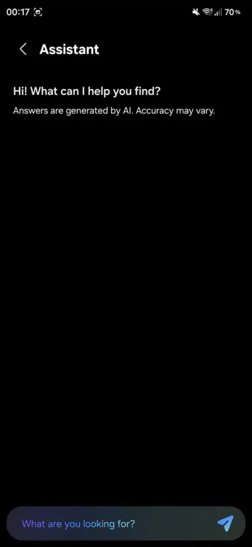 Giờ đây, Samsung dường như muốn mở rộng cách tìm kiếm dạng hội thoại này sang Galaxy Store và Theme Store. Theo hình ảnh do SamMobile chia sẻ, trong Galaxy Store xuất hiện một thanh tìm kiếm được hỗ trợ AI ở cạnh dưới màn hình, hiển thị bằng dòng chữ màu chuyển sắc. Tính năng này cho phép người dùng mô tả nhu cầu thay vì phải nhớ chính xác tên ứng dụng hay chủ đề cần tìm.