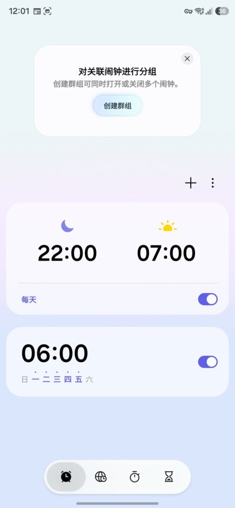 Ở mục Báo thức, Samsung thay thế giao diện dạng thẻ rời bằng một thẻ lớn duy nhất, chứa toàn bộ danh sách báo thức. Cách bố trí mới giúp hiển thị nội dung rõ ràng, sạch sẽ hơn. Đáng chú ý, nền báo thức bổ sung tùy chọn hiển thị thời tiết, nhiều khả năng sẽ tự thay đổi theo điều kiện thời tiết tại vị trí của người dùng.