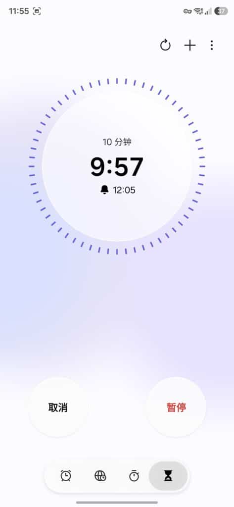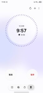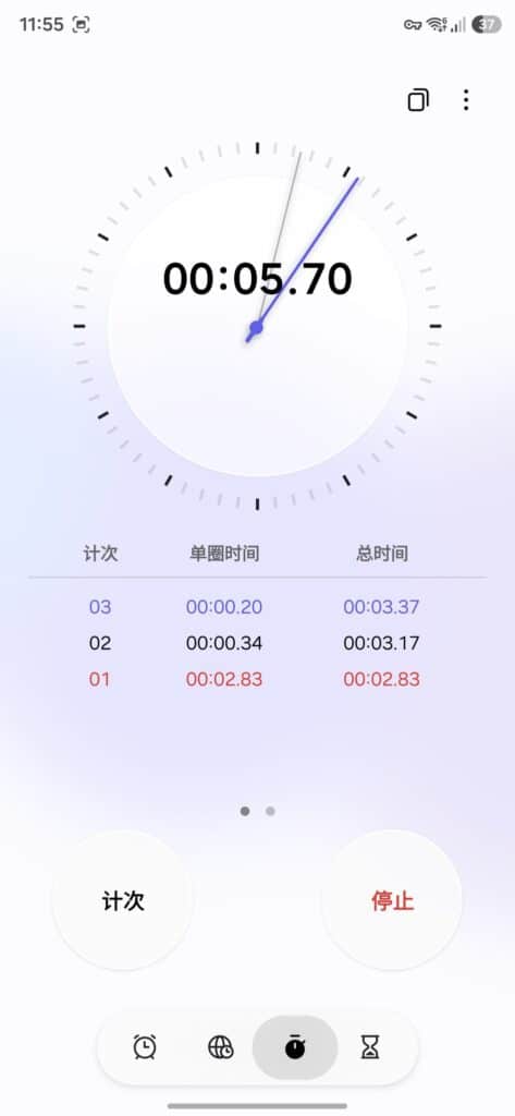 Tính năng Bấm giờ được làm mới với giao diện kết hợp giữa kỹ thuật số và analog, gồm đồng hồ tròn, vạch chia và kim ảo, thay thế cho thiết kế kỹ thuật số đơn giản trước đây. Hẹn giờ cũng sử dụng nền chuyển sắc, phù hợp tổng thể mới, đồng thời bổ sung nút bắt đầu dạng tròn lớn hơn để tối ưu thao tác.