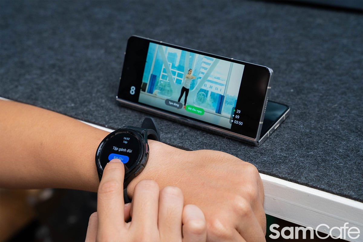 Khi kết hợp với đồng hồ thông minh Galaxy Watch, trải nghiệm tập luyện trở nên trực quan hơn: nhịp tim, lượng calo đốt cháy và thời gian tập luyện được hiển thị theo thời gian thực, đồng thời tự động lưu vào hồ sơ sức khỏe trên Samsung Health.