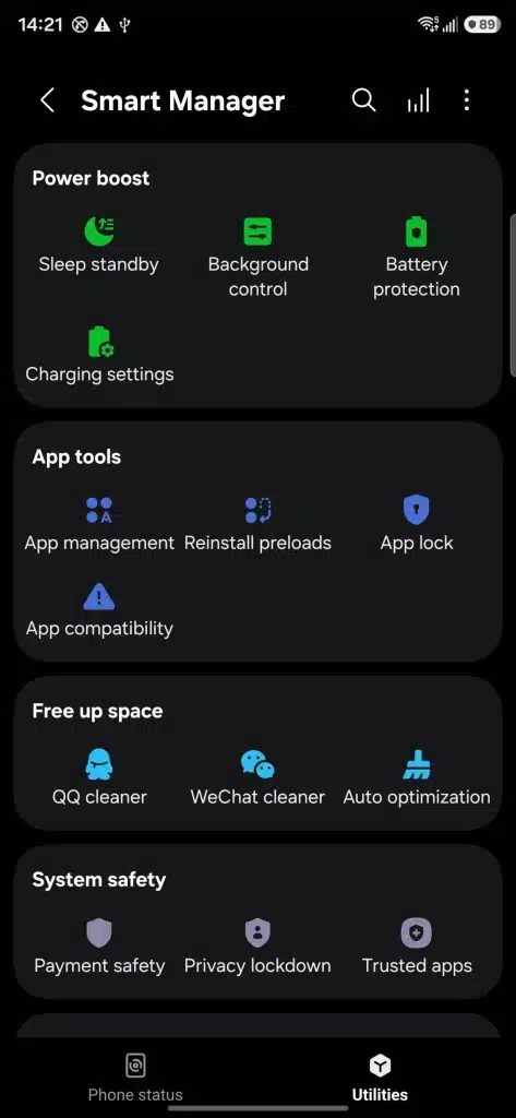 Theo leaker GalaxyTechie, người thường chia sẻ các tính năng độc quyền tại thị trường Trung Quốc, Smart Manager trên One UI 8.5 đã được thay đổi toàn diện cả về giao diện lẫn cách bố trí tính năng. Trung tâm quản lý mới chia các công cụ tối ưu và bảo trì hệ thống thành hai nhóm lớn, giúp người dùng theo dõi tình trạng thiết bị đơn giản và trực quan hơn.