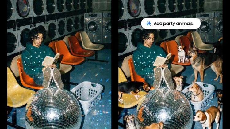 Đoạn video minh họa cho thấy một người đang ngồi trong tiệm giặt đồ. Người dùng chỉ cần nhập câu lệnh văn bản “Add party animals”, hệ thống AI ngay lập tức tạo ra các chú chó xuất hiện trong khung hình. Những đối tượng được thêm vào có tỷ lệ hợp lý, ánh sáng và vị trí tự nhiên, gần như hòa vào bối cảnh thật mà không xuất hiện viền lỗi hay chi tiết bất thường.